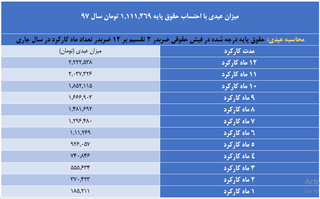 با توجه به اینکه حداقل دستمزد کارگران برای سال ۹۷ در شورای عالی کار یک میلیون و ۱۱۱ هزار و ۲۶۹ تومان تعیین شد، بنابراین عیدی کارگرانی که حقوق پایه آنها به این میزان است، ۲ میلیون و ۲۲۲ هزار و ۵۳۸ تومان خواهد بود که حداقل عیدی پایان امسال است.
